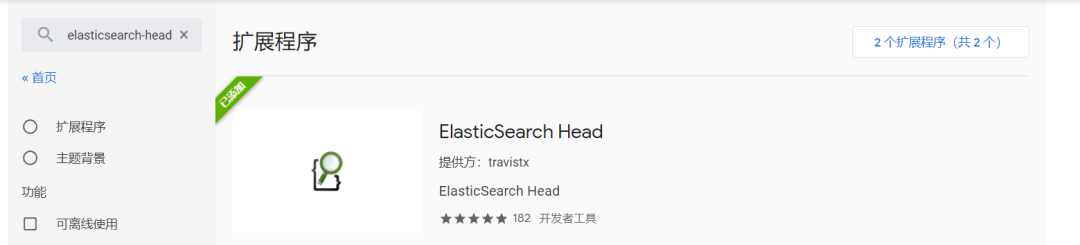 当然有,我们在 readme 文件中,发现也可以通过在谷歌浏览器上使用插件的形式来进行安装 elasticsearch-head 我们在谷歌应用商店搜索“elasticsearch-head”插件,然后将其安装,自动添加至谷歌浏览器