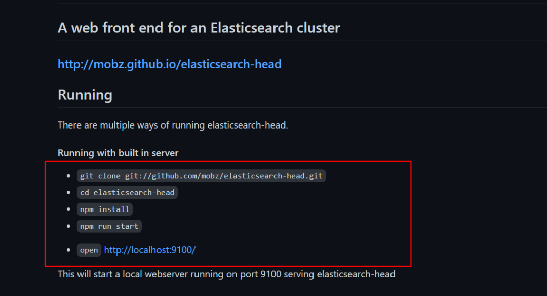 下载依赖 现在环境都准备好了,那我们该做些什么呢?其实 GitHub 上都已经写明白了 有多种方式运行 elasticsearch-head ,我们这里需要用的就是如上所示的内置服务器的方式。