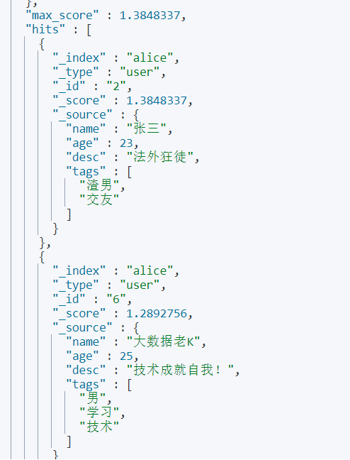 GET alice/user/_search { "query" :{ "match" :{ "tags" :"男 学习" } } } 此时我们可以观察返回的结果,可以发现只要满足一个标签 就能返回这个数据了