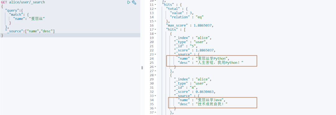 GET alice/user/_search { "query" :{ "match" : { "name" : "爱丽丝" } } } 默认的话,es会查询出文档的所有字段,如果我们只想要部分的字段 ,就可以像下面所展示的demo进行查询: