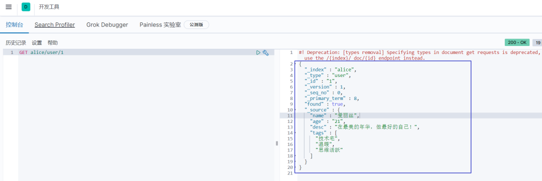 GET alice/user/_search { "query" :{ "match" : { "name" : "爱丽丝" } }, "highlight" :{ "pre_tags" : "" , "post_tags" : "" , "fields" : { "name" : {} } } } 查询结果: 好了,学到这里,关于elasticsearch 文档的基本操作基本就演示完了。我们来回顾下学习了哪些内容: