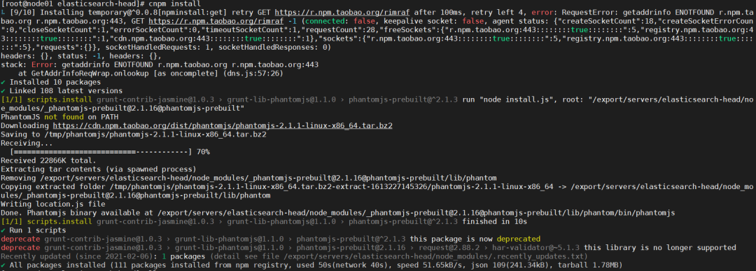 [root@node01 elasticsearch-head]# cnpm install 命令执行完毕之后,我们可以在目录下看到多出了node_modules目录,这就是我们下载好的依赖。
