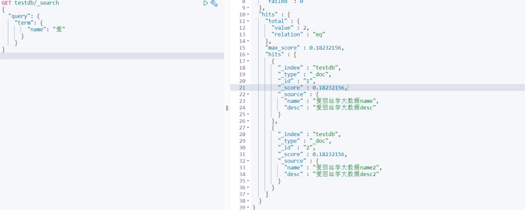 GET testdb/_search // text 会被分析器分析 查询 { "query" : { "term" : { "name" : "爱" } } } 查询结果,2条数据都能匹配到 然后用standard类型做精准测试