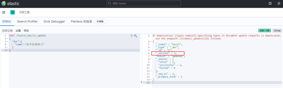 我们使用 POST 命令,在 id 后面跟 _update ,要修改的内容放到 doc 文档(属性)中即可。 可以发现此时更新之后的version变成了3。所以,一旦索引被创建了之后,所有的修改都可以通过版本号看到变化。