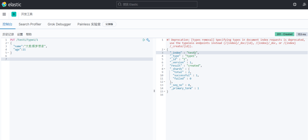 // 命令解释 // PUT 创建命令 test1 索引 type1 类型 1 id PUT /test1/type1/1 { "name" :"大数据梦想家" , "age" :21 } 如下图所示: 返回结果 (是以REST ful 风格返回的 ): 然后我们在elasticsearch-head