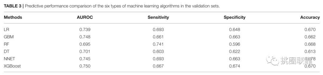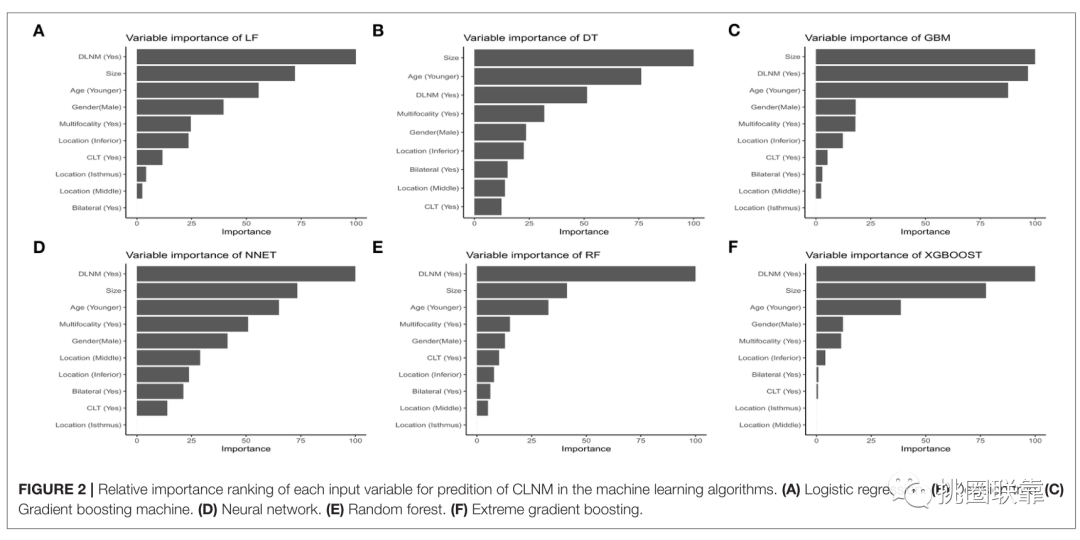 疾病:乳头状甲状腺癌(Papillary Thyroid Carcinoma);本篇范文是一项临床大样本的回顾性研究,作者分析的数据是自己的临床数据,但从这一点来看,是不是就好像为临床大夫们量身定制的套路呀!乳头状甲状腺癌(PTC)是常见的内分泌恶性肿瘤之一。临床上常以中央淋巴结解剖(CLND)治疗,其目的是适当的清扫颈部淋巴结。相比之下,预防性中央淋巴结解剖(pCLND)由于缺乏随机对照数据而没有被推广。但临床上,为了防止cN0的PTC患者复发和第二次手术,更需要个性化的治疗方案来准确预测中央淋巴结转移(CLNM)发生的重要性。由此,作者想要通过机器学习(ML)建立一个预测模型解决上述临床问题。ML其实是一种新型的人工智能(AI),能够通过强大的预测能力,开发出在某些情况下优于传统统计模型的预测工具,从而更好地预测CLNM状态。在本研究中作者通过ML算法以最佳的Xgboost模型获得可接受的CLNM预测,结合术前和术中危险因素,开发出在某些情况下优于传统统计建模的预测工具,从而能够更好地预测CLNM状态。本篇范文是一篇典型的机器学习算法套路的文章,研究的数据是临床上未参与的中央颈部淋巴结甲状腺乳头状癌(PTC)患者信息。出发点就源于目前尚无明确非侵入性的T1-T2期肿瘤,是否需要进行中央淋巴结清扫。这也是本文的一个创新点。范文研究的目的呢,就是开发并验证一个基于机器学习算法的预测模型,用来评估这些患者中心淋巴结转移(CLNM)的风险。当然,我们也可以在生信分析后,加一个对于数据集临床信息的机器学习,加加分。只要有临床数据信息和相对来讲较为正确的标签就可以化数据集为“临床研究”。接下来就是函数的各种应用,好啦我们马上就来学习范文吧!本篇范文纳入的临床样本是接受手术的1,271例T1-T2期,无创性和临床淋巴结阴性(cN0)PTC患者。首先,总结这些患者的临床病理特征,分析基线资料。作者将数据集随机分为两组,即用于ML模型开发的训练集(70%)和用于性能评估的验证集(30%),然后重复此随机分裂,直到患者数据分为两组。这一步骤是机器学习算法的最基础,也是最重要的部分,后续的分析都是建立在此基础上的,小伙伴们一定要先学习算法的基础呀!否则基线不一致,后面的都是空中楼阁~然后就直接进入正题,使用机器学习算法的ROC曲线分析,用于预测验证集中患者出现CLNM的临床节点。接下来,作者根据CLNM分组,进行单因素和多因素逻辑回归分析。在单变量分析中,作者发现肿瘤大小、性别、年龄、多灶性,双侧病变,DLN定位均显著相关,而CLNM阳性和阴性组间肿瘤的位置没有显著差异。在多变量logistic回归分析中(表2),作者列出了包括年龄、性别、CLT、DLN、多灶性、双侧性、肿瘤大小和位置等在内的因素,是否能够作为预测CLNM阳性的独立预后因素。这一部分是文章中的高潮部分。作者开发了六种类型的ML算法来对数据建模:逻辑回归(LR),梯度提升机(GBM),极限梯度提升(XGBoost),随机森林(RF),决策树(DT)和神经网络(NNET) 。在训练过程中,考虑对基于ML的模型进行调整以避免过度拟合,而针对ML模型的最佳超参数是5倍交叉验证。然后,通过使用R语言对ML算法进行进一步训练,以预测CLNM的风险。作者在验证集中评估了具有相同超参数的每个ML分类器的预测能力,该验证集中的接收器工作特征(AUROC)下的面积值,并计算了ML算法的相应灵敏度、特异性和整体准确性。这六种ML算法模型在验证集中的预测性能比较见表3和图1。其中,作者详细说明了验证集中的六个ML算法模型之间的预测性能比较。结果表明,XGBoost模型在预测CLNM方面表现出最高的性能,其验证集中的AUROC为0.750,灵敏度为0.667,特异性为0.674,准确性为0.670。在ML算法性能的比较中,AUC越接近1,则分类模型执行得越好。因此,作者选择XGBoost模型作为最终的预测模型。然后,作者比较了变量在机器学习算法中的相对重要性。如图2所示,可以看到模型的总体趋势。虽然这些ML算法中各变量的重要性略有差异,但Delphian淋巴结转移、肿瘤大小、年龄、性别、多灶性等因素无一例外地排在前五名。相反,双侧病变、肿瘤位置在中、峡部极、CLT等变量对CLNM的预测贡献不大。结果如图2,显示了每种CLNM预测ML算法中变量的相对重要性。我们可以看到有普遍的证据趋势:尽管在这些ML算法中变量的重要性显示出细微的差别,但包括Delphian淋巴结转移,肿瘤大小,年龄,性别,多灶性在内的因素均排在前五位。相反,诸如双侧病变,中部或峡部中部的肿瘤位置和CLT之类的变量对CLNM预测的贡献很小。XGBoost模型中高级变量的重要性按降序排列:德尔福淋巴结转移,肿瘤大小,年龄,性别,多灶性和肿瘤位置。最后,作者基于性能最佳的模型,创建了一个在线风险计算器,该计算器可以使用新输入的PTC患者数据进行预测,从而使临床医生可以轻松访问这些患者中的CLNM风险。这个Web计算器可预测T1-T2期,非侵入性和临床淋巴结阴性PTC患者的中心淋巴结转移。只需输入现成的术前和术中临床病理变量(https://jin63。shinyapps.io / ML_CLNM /)本篇范文作者采用了性能最佳的ML算法模型,用于估算个人发生CLNM的可能性。创新点就是,作者第一个使用ML算法开发具有CLMN实时风险评估的预测模型的研究模型。作者应用了六种机器学习(ML)算法,包括逻辑回归(LR),梯度提升机(GBM),极端梯度提升(XGBoost),随机森林(RF),决策树(DT) ,以及神经网络(NNET)结合术前的临床特征和术中