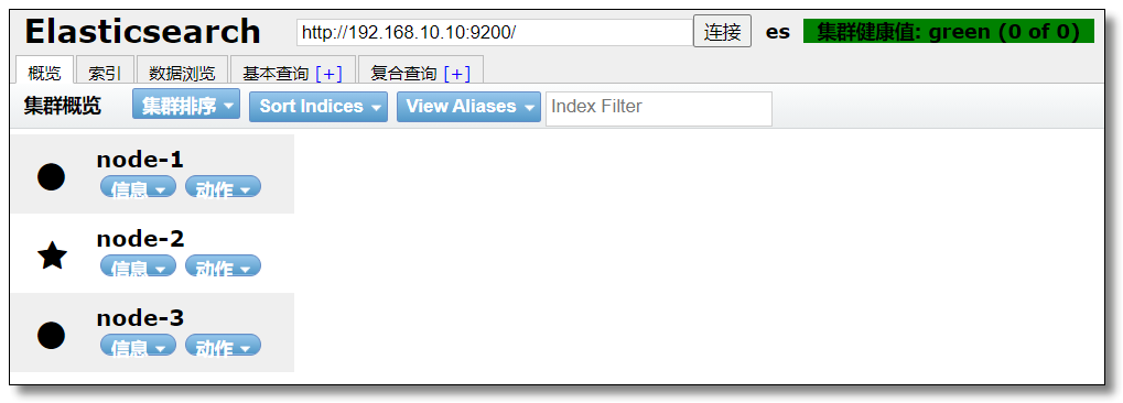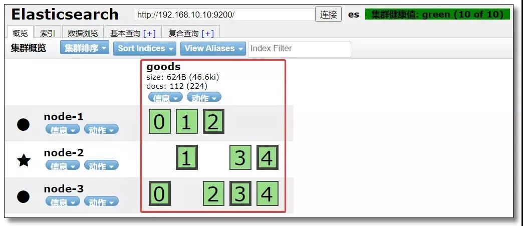 下图为 elasticsearch-head 插件(浏览器可以直接安装该插件进行连接)显示的集群信息。