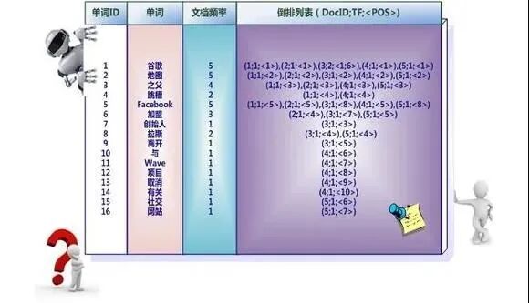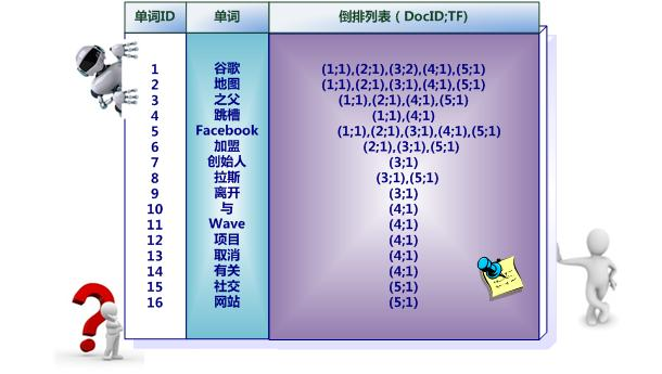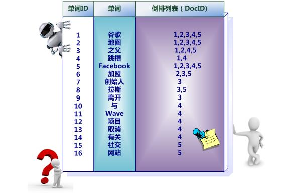 在图中,“单词 ID”一栏记录了每个单词的单词编号,第二栏是对应的单词,第三栏即每个单词对应的倒排列表。比如单词 谷歌,其单词编号为 1,倒排列表为 1,2,3,4,5,说明文档集合中每个文档都包含了这个单词。