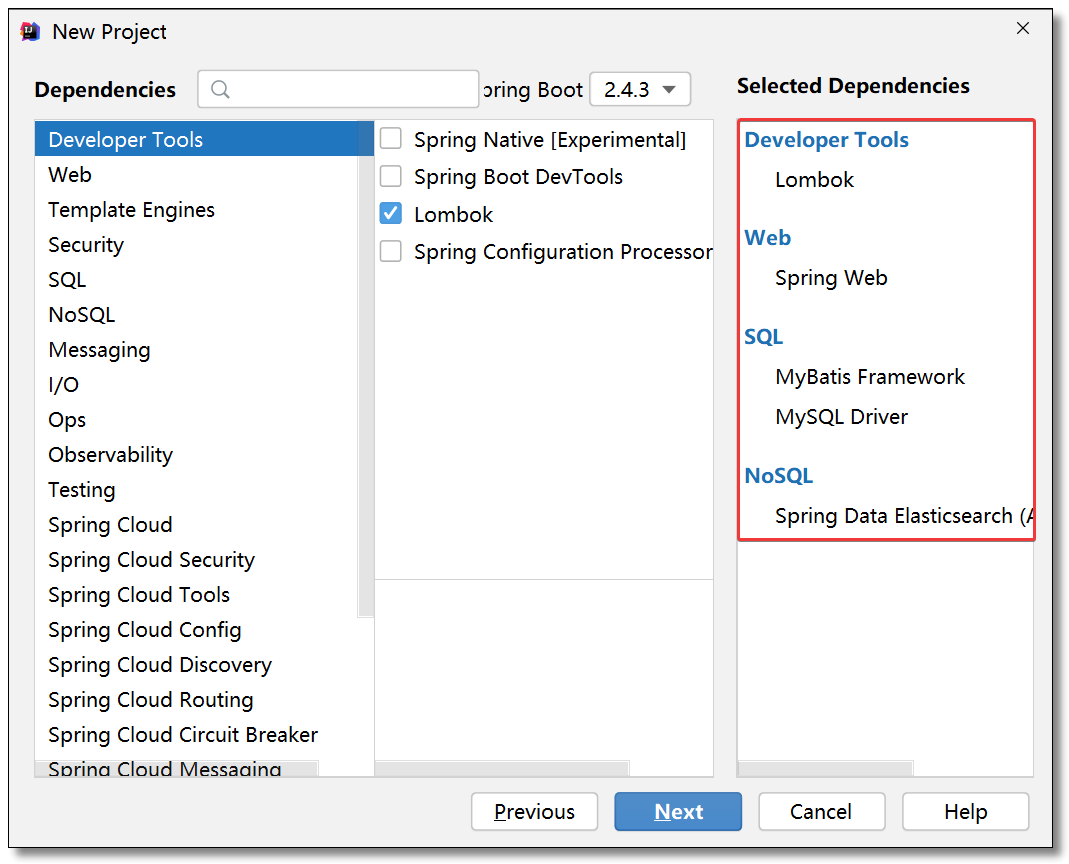 使用 Spring Initializr 初始化 Spring Boot 项目,添加 Spring Web,Spring Data Elasticsearch,MySQL,MyBatis,Lombok。
