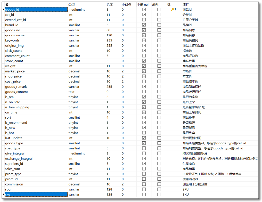 MySQL 商品表的字段是非常多的,而商城搜索页面所需要的数据无非就是商品ID、商品名称、商品价格、商品评论数和商品原始图等(根据自己实际开发情况而定,这里根据本文案例前端样式进行分析)。