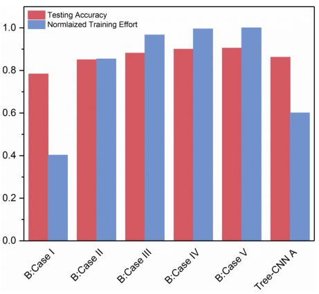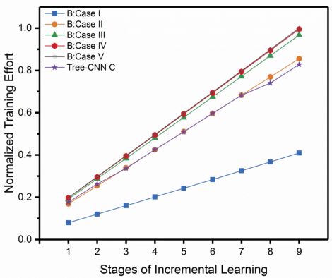 从图 7、图 8 中可以看出 Tree-CNN 的准确率已经和微调整个网络相差无几,但是在 Training Effort 上却远小于微调整个网络。