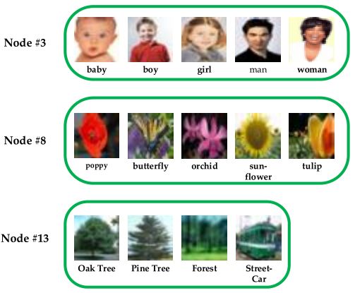 从图 9 所示分类结果中可以看出,在各个枝节点中,具有相同的特性的类被分配在相同的枝节点中。这一情况在 CIFAR-100 所得到的 Tree-CNN 最终的结构中更能体现出来。