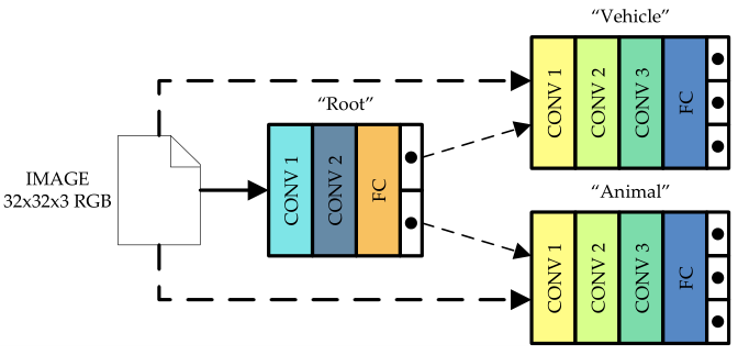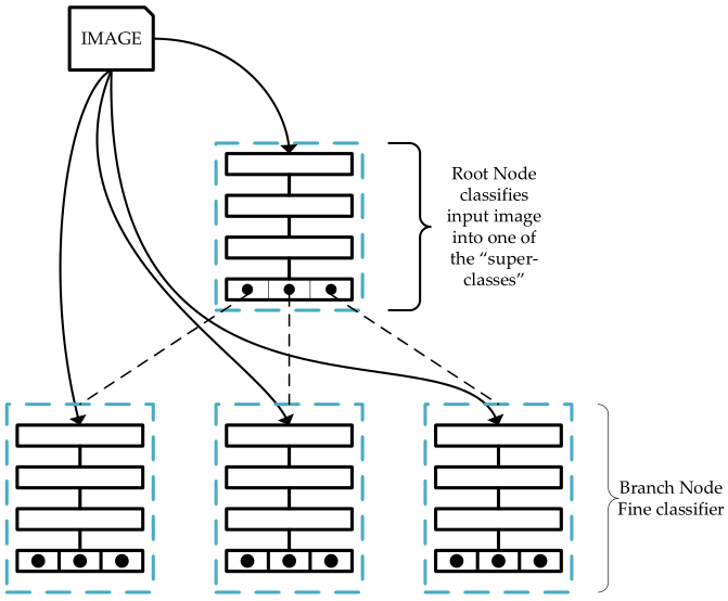 本文提出的网络结构如下图所示。对于一张图像,首先会将其送到根节点网络去分类得到“super-classes”,然后根据所识别到的“super-classes”,将图像送入对应的节点做进一步分类,得到一个更“具体”的类别,依次进行递推,直到分类出我们想要的类。