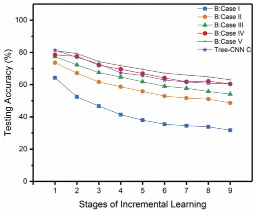 根据文中的策略,Frog、Deer、Bird 将会被加入到动物类节点,同样 Airplane 将会被加入到交通工具类节点。经过 incremental/lifelong learning 后的 Tree-CNN 的结构如图 3(b)所示。 具体训练过程如图 6 所示。