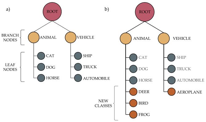 在 CIFAR-10 的实验中,作者选取 6 类图像作为初始训练集,又将 6 类中的为汽车、卡车设定为交通工具类,将猫、狗、马设为动物类,因此构建出的初始树的结构如图 3(a)所示。