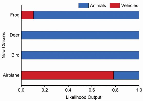 当新的类别出现时(文中将 CIFAR-10 另外 4 个类别作为新类别),按照文中的学习策略,我们先利用根节点的网络对四种类别的图片进行分类,得到的输出情况如图 5 所示,从图中可以看出,在根节点的识别中 Frog、Deer、Bird 被分类为动物的概率很高,Airplane 被分类为交通工具的概率较高。
