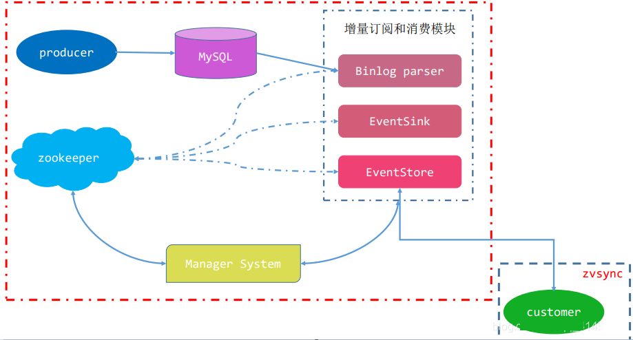 - canal模拟mysql slave的交互协议,伪装自己为mysql slave,向mysql master发送dump协议