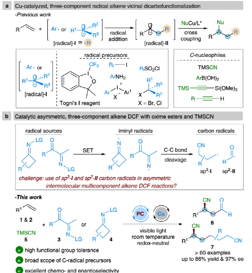 三组分进行烯烃相邻碳的双羰基官能团化反应能够在烯烃分子中安装两个不同的碳基团,虽然人们对该反应的离子型反应特征进行深入理解,该反应中基于自由基过程实现对映选择性仍未受到广泛关注。有鉴于此,华中师范大学肖文精、陈加荣等报道了一种分子间对映选择性三组分自由基加成交叉偶联反应,具体通过光催化/Cu催化协同催化实现。实现该反应的关键之处在于酰基、氰基烷基自由基的选择性加成。