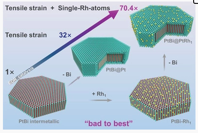 合理设计和控制单原子位点的电催化剂可以实现前所未有的原子利用率和催化性能,然而在多金属合金中仍然极具挑战性。近日,南方科技大学权泽卫教授报道了通过原子电偶置换在有序PtBi纳米板(PtBi-Rh1)上分离Rh原子,并随后通过电化学去合金化转变为具有拉伸应变的Pt-Rh单原子合金(PtBi@PtRh1)。