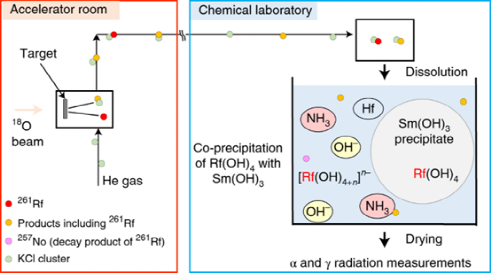 所有原子序数(Z)≥104的超重元素(SHEs)都是人工合成的,其化学性质在很大程度上尚不清楚。由于这些重核的寿命很短,而且产量极低,所以相关的化学实验仅能在单个原子上进行,而且大多仅限于吸附和萃取。有鉴于此,大阪大学的Yoshitaka Kasamatsu等人深入研究了超重元素Rf (Z = 104)的沉淀特性,主要研究了Rf在含NH3或NaOH的碱性溶液中的共沉淀行为。