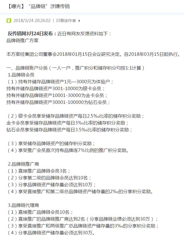 随后,小编也发现“品牌链”早在今年的3月24日就被反传销网定性为“涉嫌传销”,根据我国禁止传销条例,“品牌链”模式的奖金制度和禁止传销条例有冲突。