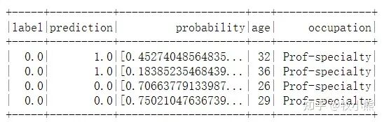 selected = predictions.select("label" , "prediction" , "probability" , "age" , "occupation" ) display(selected) selected.show(4 )