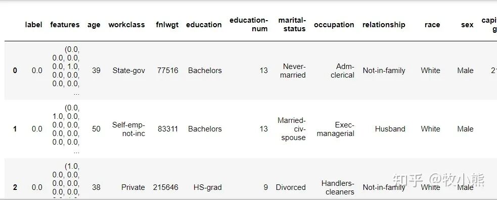 from pyspark.ml import Pipelinefrom pyspark.ml.feature import StringIndexer, OneHotEncoder, VectorAssembler stages = []for col in cat_features: # 字符串转成索引 string_index = StringIndexer(inputCol = col, outputCol = col + 'Index' ) # 转换为OneHot编码 encoder = OneHotEncoder(inputCols=[string_index.getOutputCol()], outputCols=[col + "_one_hot" ]) # 将每个字段的转换方式 放到stages中 stages += [string_index, encoder]# 将income转换为索引 label_string_index = StringIndexer(inputCol = 'income' , outputCol = 'label' )# 添加到stages中 stages += [label_string_index]# 类别变量 + 数值变量 assembler_cols = [c + "_one_hot" for c in cat_features] + num_features assembler = VectorAssembler(inputCols=assembler_cols, outputCol="features" ) stages += [assembler]# 使用pipeline完成数据处理 pipeline = Pipeline(stages=stages) pipeline_model = pipeline.fit(df) df = pipeline_model.transform(df) selected_cols = ["label" , "features" ] + cols df = df.select(selected_cols)因为pyspark显示的数据比较像Mysql 那样不方便观看,因此我们转成pandas: