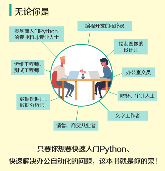 这本书的目的就是为零基础、从未接触过Python的职场人士,提供各种让工作高效、自动化的工作方法。