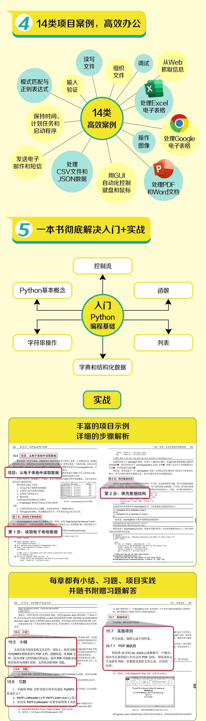 第15章 处理PDF和Word文档”介绍通过编程处理PDF和Word文档的方法。
