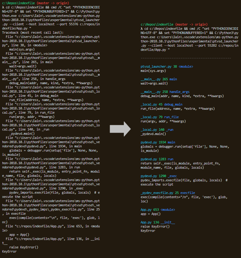 PrettyErrors是一个精简Python错误信息的工具,PrettyErrors只做一件事,它支持在终端进行彩色输出,标注出文件栈踪迹。这样一来,你就不需要扫描整个屏幕来找到异常的部分。开源地址:https://github.com/onelivesleft/PrettyErrors