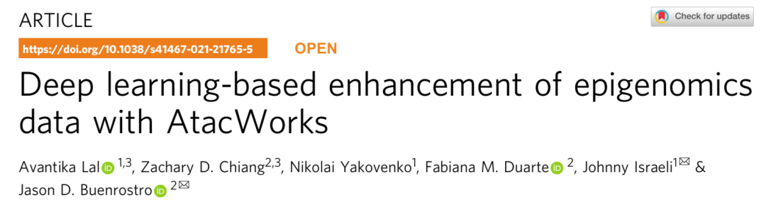 Lal A, Chiang ZD, Yakovenko N, Duarte FM, Israeli J, Buenrostro JD. Deep learning-based enhancement of epigenomics data with AtacWorks. Nat Commun. 2021 Mar 8;12(1):1507. doi: 10.1038/s41467-021-21765-5. PMID: 33686069.