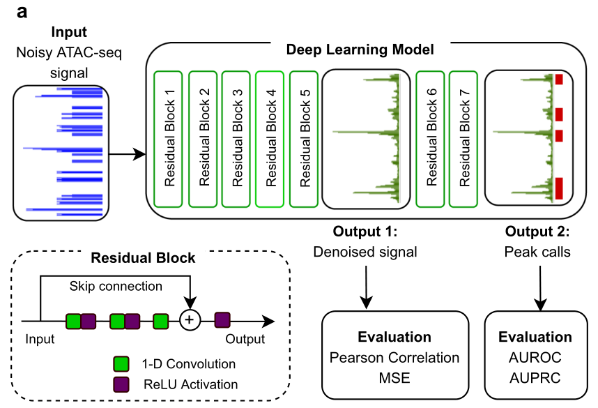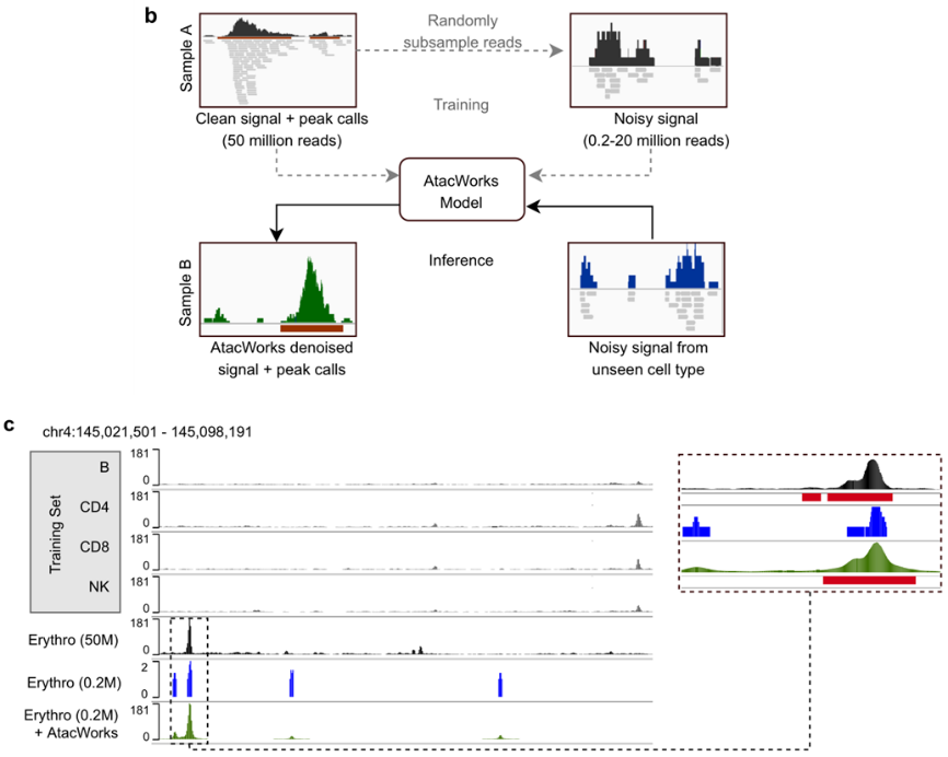 图3. 利用AtacWorks对ATAC-seq数据进行去噪,来源:Nature Communications