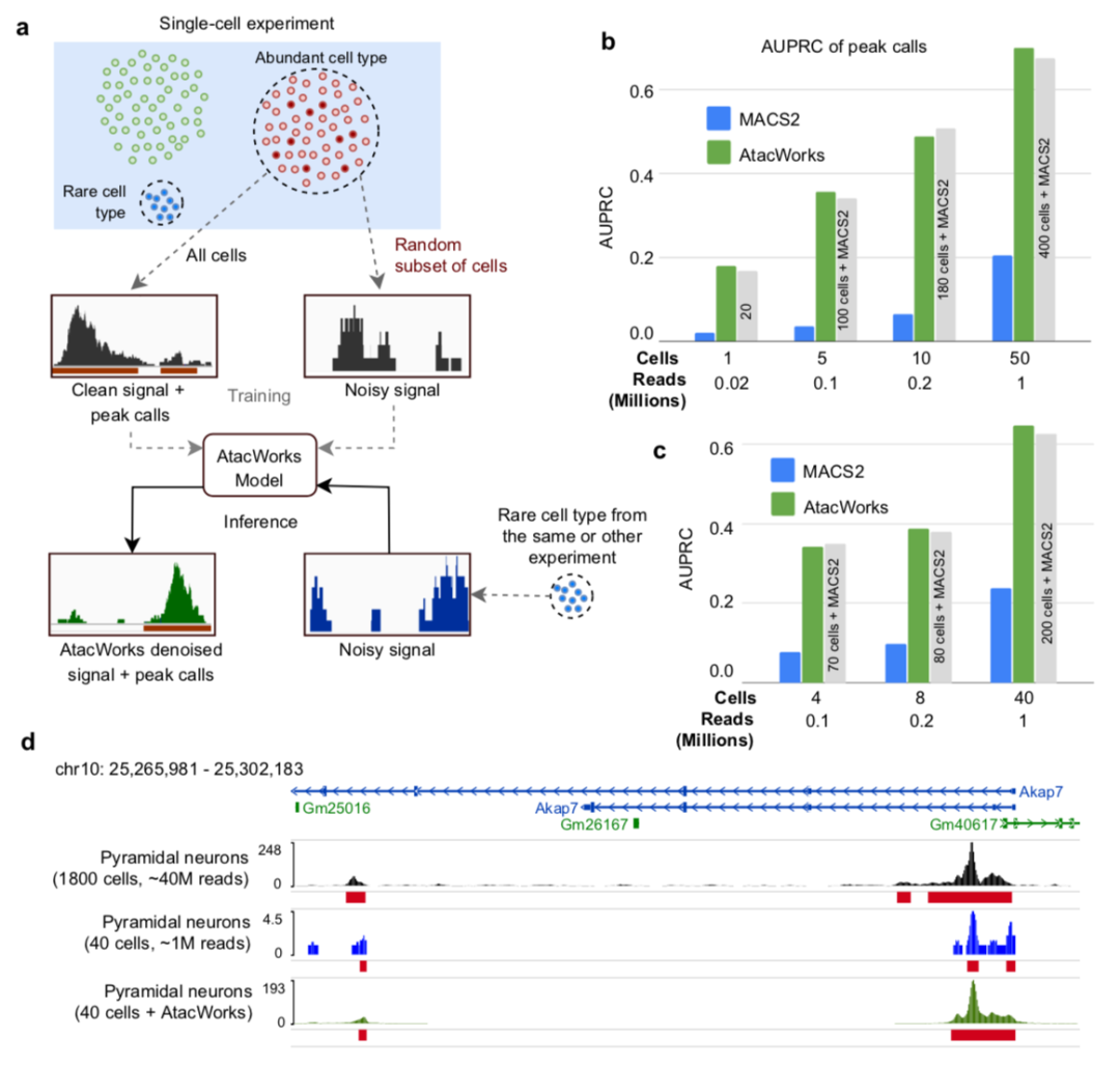 为解决上述挑战,NVIDIA公司和哈佛大学的研究团队联合开发了AtacWorks深度学习工具包,可对整个基因组进行推断,提高单细胞实验的灵敏度,并显著减少运行稀有类型单细胞实验所需的时间和成本。该研究成果发表在Nature Communications上,文章题为“Deep learning-based enhancement of epigenomics data with AtacWorks”。