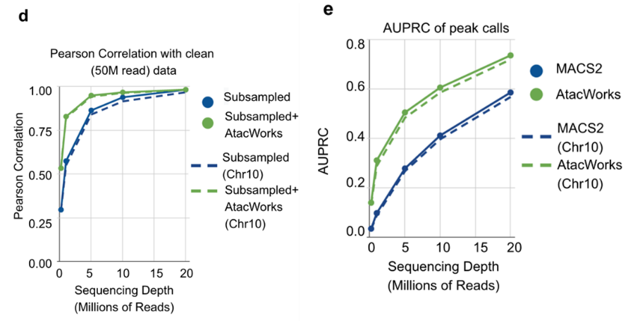 为评估该方法的普适性,研究者通过红系细胞的ATAC-seq数据测试了模型的性能。首先对红系细胞的读数进行二次抽样,使其达到与训练数据相同的深度,对于每个测序深度,将训练后的模型应用于相应的二次采样数据集,以获得预测的高覆盖率信号轨迹和峰值调用。通过检查得到的去噪轨迹,证实了AtacWorks可识别出训练数据中不存在的细胞类型特异性峰,包括与红系细胞标记基因GYPA相邻的区域。这表明该模型学习的是染色质可及性的通用特征,而不是细胞类型的特定模式(图2)。