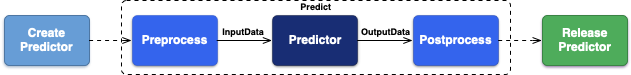 推理的过程整体只有一类 API:对输入数据(input)执行推理,同步返回输出数据(output)。图中和模型直接相关的前后处理的流程,都被封装在了 AI 能力推理接口内部,用户既不需要关心,也不需要任何处理。为了方便不同业务不同的输入,每个能力的推理接口可能有几个,这几个接口能力完全相同,唯一不同的只是输入和输出类型,用户通常只需要根据自己的输入输出类型关心最便捷使用的一个即可。