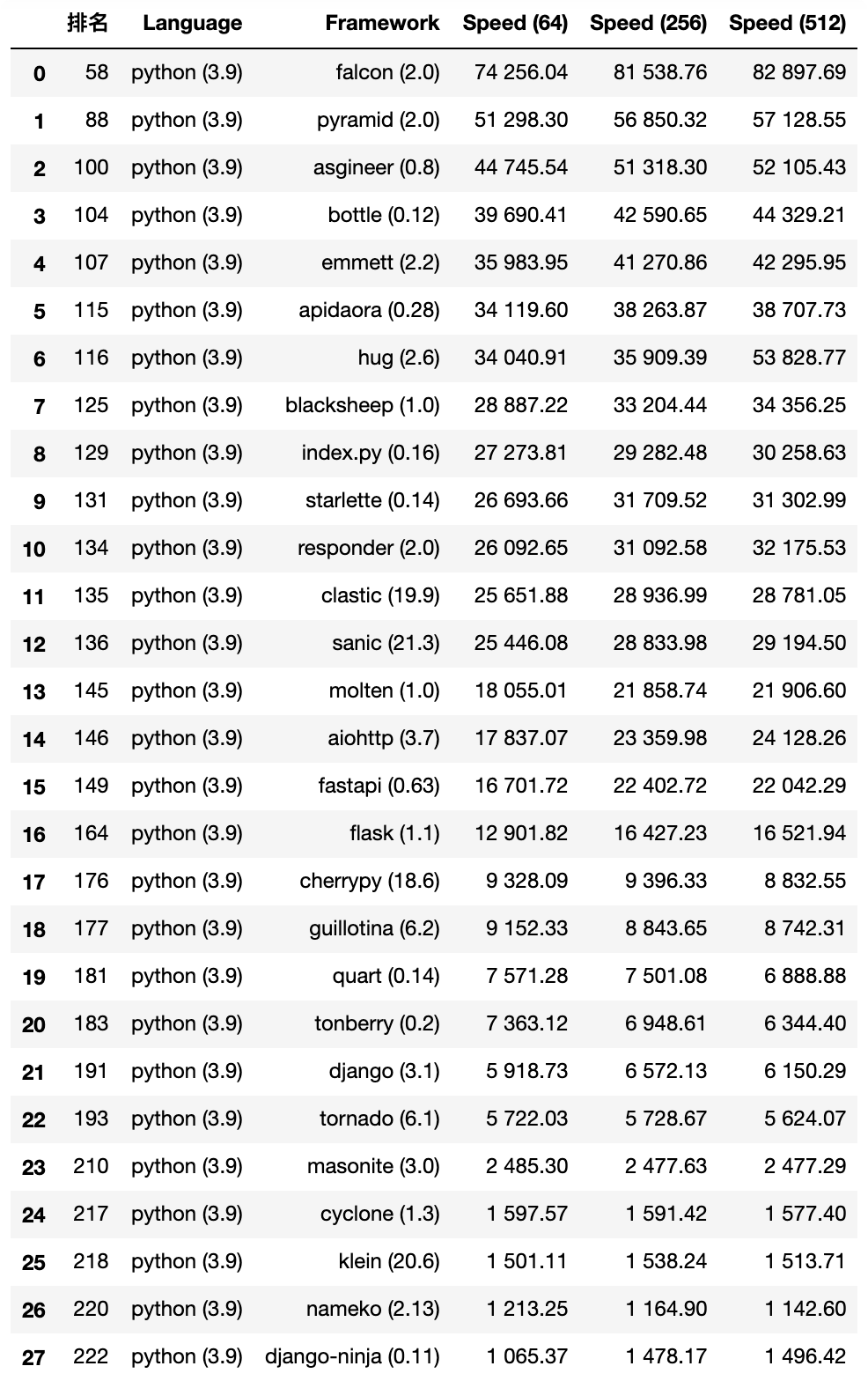 这是所有的 Python Web 框架速度测试,有人可能会问为什么不是从 1 开始排序的,因为这个项目的测试还包含 golang、java、php 等众多语言的 Web 框架,共有 226 款。这里我们只用 Python 来做对比。
