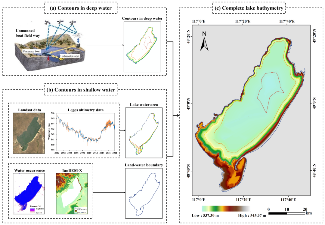 图1. 呼伦湖完整水下地形重建流程。(a)基于无人船生成深水区等高线;(b)结合影像、测高数据、GSW和DEM数据获取浅水区等高线;(c)重建呼伦湖完整水下地形。