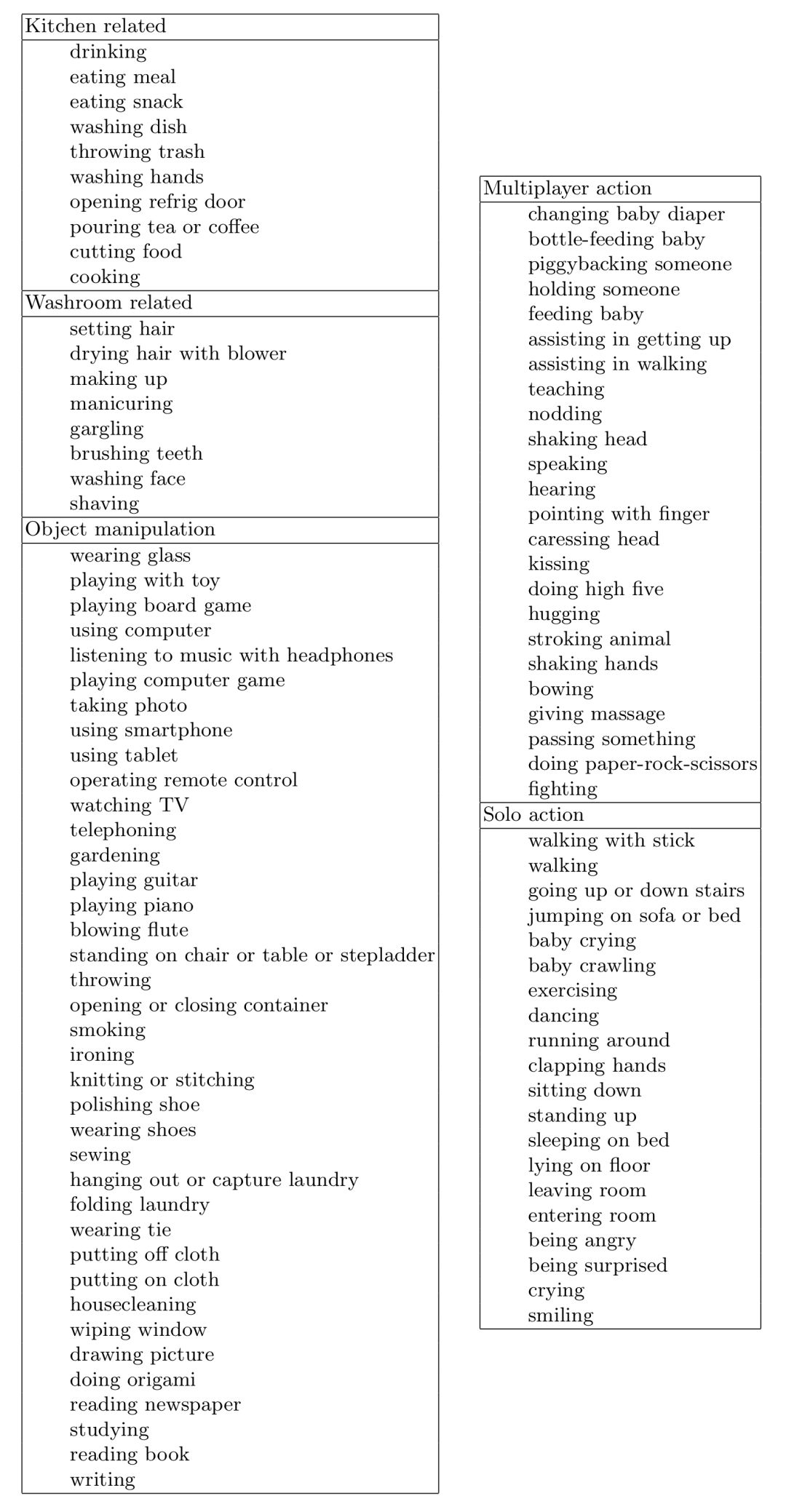 STAIR Actions 是一个用于动作识别的大规模视频数据集,包含 100 类诸如吃饭、喝水、洗手、扔垃圾等人类日常行为,每一类动作有 1000 个左右的视频。作者保留了 10% 的数据用于后续比赛。