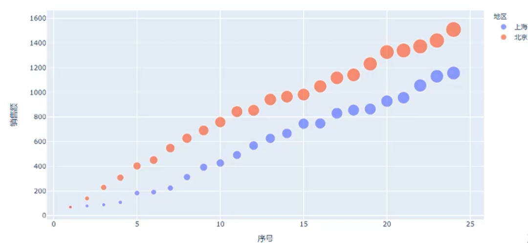 px.scatter(df,x = '序号', y = '销售额', color = '地区', size ='销售额'