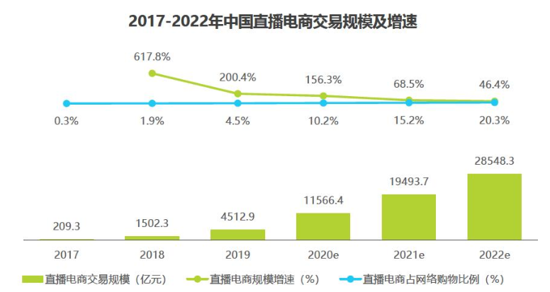 2019年,直播电商行业整体成交额达4512.9亿元,同比增长200.4%,仅占网购整体规模的4.5%,成长空间较大,预计未来两年仍会保持较高的增长态势。随着内容平台与电商交易的融合程度不断加深,预计2022年直播带货的渗透率可以增长到 20.3%。