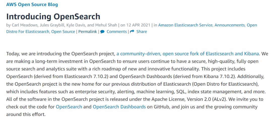昨日,AWS 宣布推出 OpenSearch 项目,这是 fork 自 Elasticsearch 和 Kibana 的开源分支。