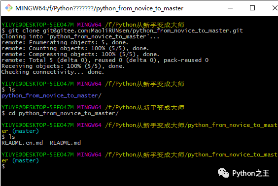 在新电脑新建一个文件夹,再使用git clone git@gitee.com:MaoliRUNsen/python_from_novice_to_master.git克隆下来。
