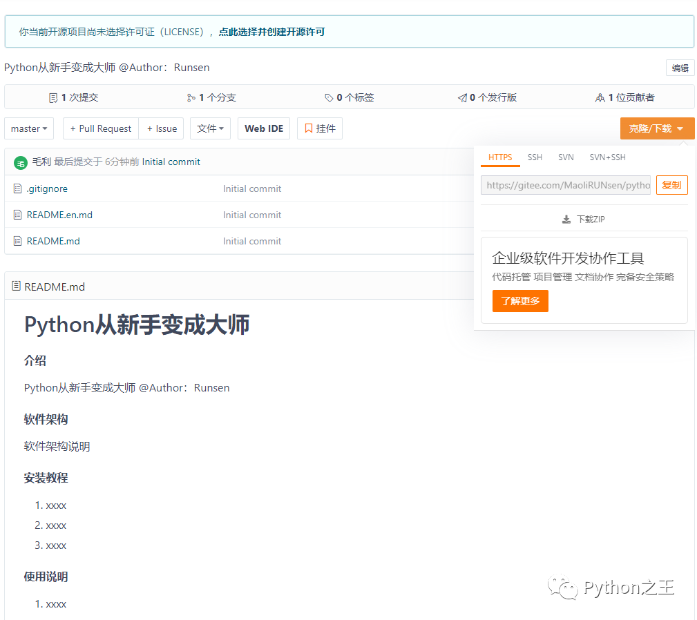 下一步点击下载SSH,复制下来,也就是git@gitee.com:MaoliRUNsen/python_from_novice_to_master.git