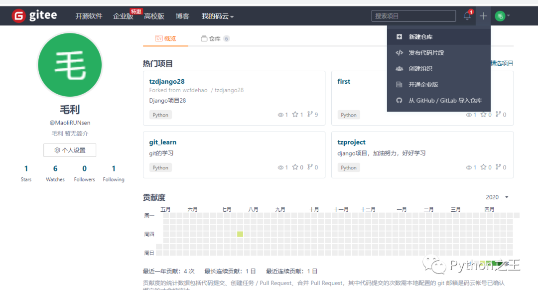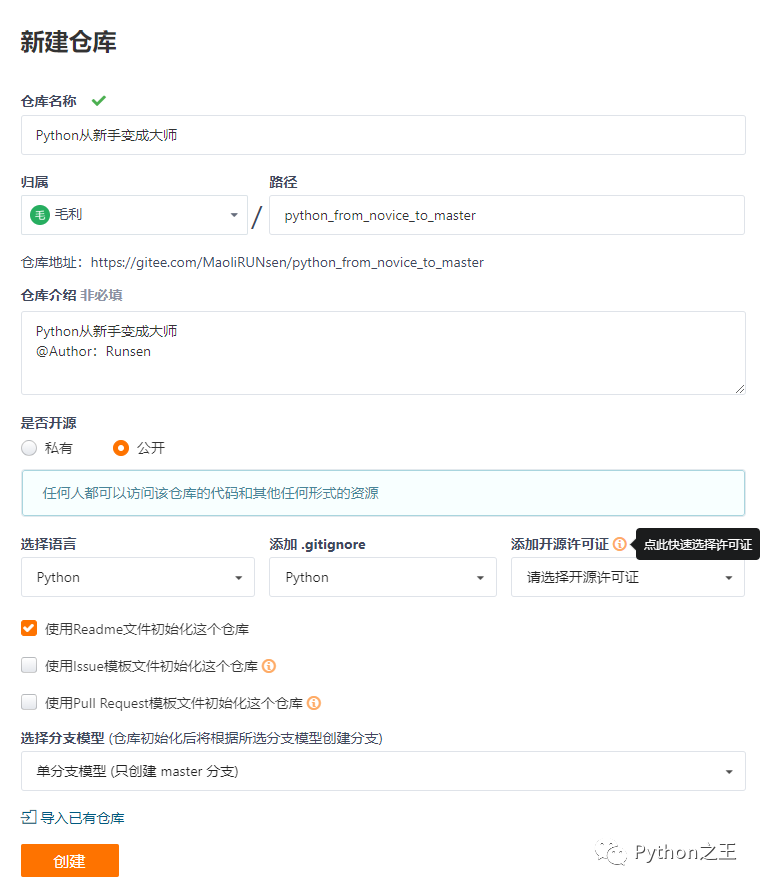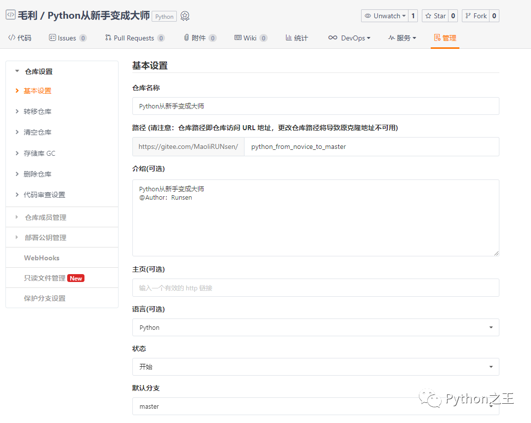 git init # 创建仓库 git remote add origin git@gitee.com:MaoliRUNsen/python_from_novice_to_master.git7、推送到远程仓库 当本地工作完成,需要将代码推送到远程仓库,使用git push命令