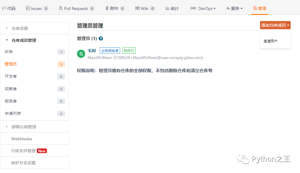 这里你直接可以邀请用户,注意这个和Fork是不一样的,Fork就是提交修改的请求,需要成员的同意。新建成员就可以同意提交修改的请求。