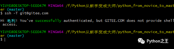 ssh -T git@gitee.com首次使用需要确认并添加主机到本机SSH可信列表。若返回 Hi XXX! You've successfully authenticated, but Gitee.com does not provide shell access. 内容,则证明添加成功