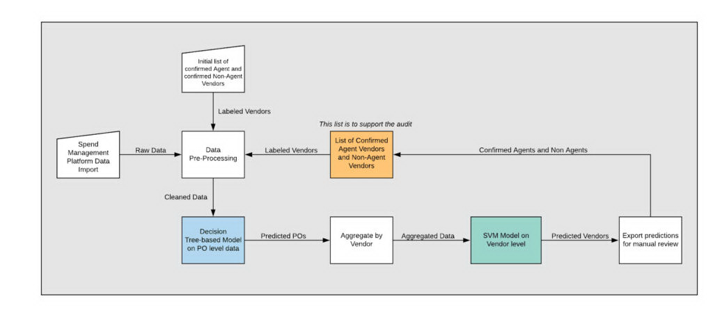 其中一个主要的障碍是我们没有大量的标签和可用数据。根据我们最初对当地团队的调查,我们在 477 个供应商中,有 47 个被标记为代理。从数据科学家的角度来看,这些样本并不足以训练任何模型。为增加组中的记录数量,我们将数据集从供应商扩大到采购订单。有关如何进行此工作的信息,请参阅模型设计部分。