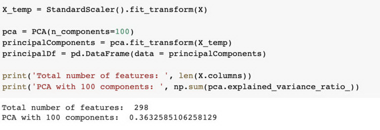 在对我们分类的特征(例如货币和部门)进行虚拟编码(或者独热编码)之后,我们最终得到了近 300 个特征。在这里我们可以考虑降维问题,降维通常可以提高训练速度,提高模型性能,或者两者兼而有之。采用主成分分析(Principal Component Analysis,PCA)的方法对 100 个成分进行了分析,仅有 36% 的方差对结果进行了解释。由于三分之一的数据给我们的解释方差只有三分之一多一点,看来我们需要使用所有的特征来捕捉整个画面,因此我们通过模型来推出所有可用的特征。