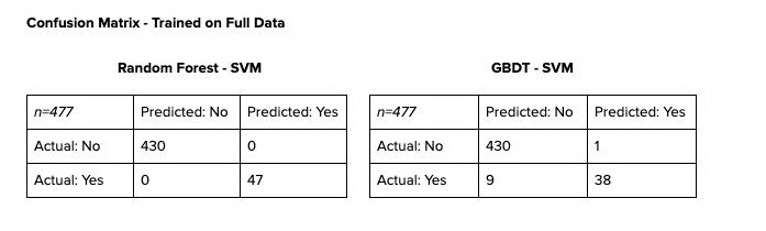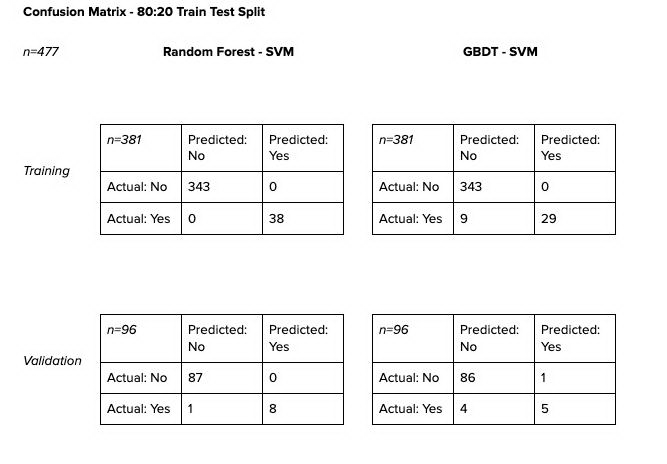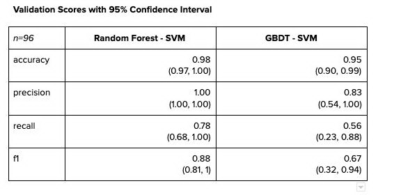 混淆矩阵显示了有希望的结果。但是,对于如此小的样本,我们在评估结果时必须非常谨慎。尽管随机森林 - 支持向量机在同类产品中的表现明显优于梯度提升型决策树 - 支持向量机,但我们不能很快地完全否定梯度提升决策树 - 支持向量机。以下是验证分数及其 95% 的置信区间。虽然在每个统计量的点估值之间存在显著差异,但是实际上,两个模型之间的置信区间有相当大的重叠。将模型应用到实际生产中,所得到的输入越多,置信区间越窄,点估计就越更准确。