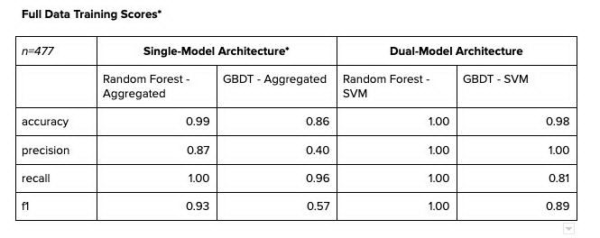 表 4:两种架构的完全训练过的模型的分类报告 * 注:此表仅用于演示单模型和双模型架构之间的同类比较。